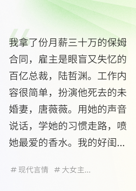 唐薇薇陆哲渊方琳是著名作者霏Moon成名小说作品《他复明那天,死去的未婚妻和我并肩站他面前》中的主人翁,这部作品构思新颖别致、设置悬念、前后照应,简短的语句就能渲染出紧张的气氛。那么唐薇薇陆哲渊方琳的结局如何呢,我们继续往下看“他复明那天,死去的未婚妻和我并肩站他面前”